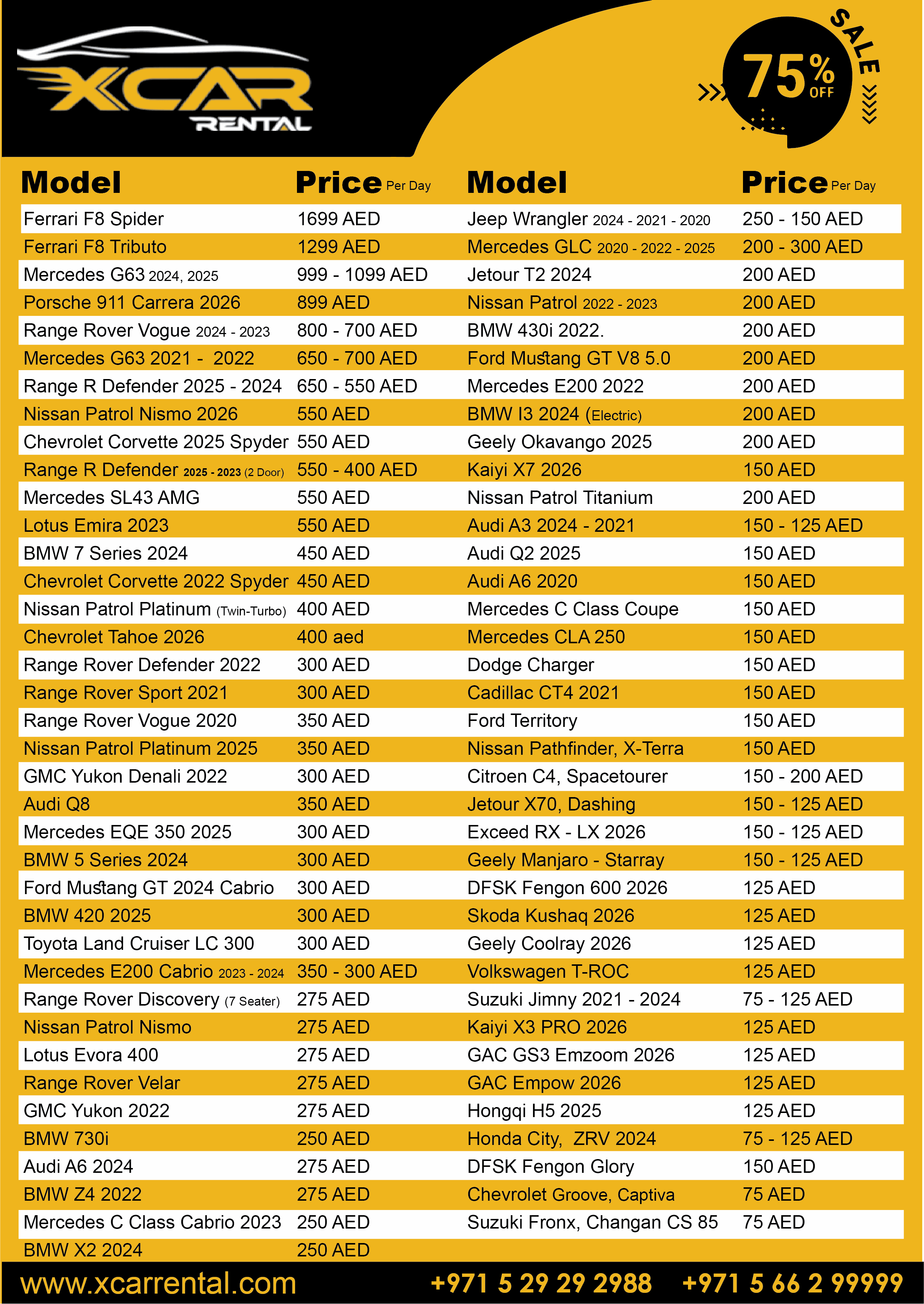 Car Rental Price List in Dubai